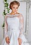 Нежное элегантное свадебное платье из плотного атласа с закрытыми плечами и длинными рукавчиками из кружева. Ажурные узоры тончайшего кружева особенно эффектно смотрятся на фоне нежной кожи зоны декольте и рук. Строгий корсет также полностью обтянут кружевной тканью. Линия талии выделена широким атласным поясом с изумительно красивой блестящей вышивкой.
