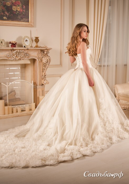 Роскошное свадебное платье с очень пышной юбкой. Строгий корсет на шнуровке соблазнительно обтягивает фигуру и эффектно подчёркивает все её женственные изгибы. Лиф, шикарная юбка и огромный шлейф украшены объёмными розами из ткани. Настолько изысканное и просто великолепное платье способно превратить невесту в сказочную принцессу.