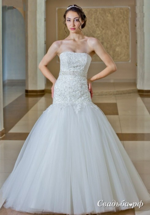 Элегантное свадебное платье с удлиненным корсетом, расшитым кружевом ришелье, и фатиновой юбкой. Кружевной корсет с лаконичным прямым лифом также задекорирован сверкающим бисером и бусинами. Линия талии дополнительно выделена декоративным поясом из стразов. Пышная юбка кокетливо колышется в такт легким шагам прекрасной невесты.