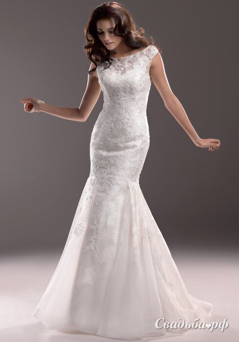 Простое и прекрасное платье из нежной органзы. Кружево ручной работы своим ажурным узором покрывает платье по всей длине. Вырез лодочка изящно переходит в кружевную спинку платья, вдоль которой спускается элегантный ряд жемчужных пуговиц. Юбка силуэта «Русалочка» расширяется книзу кокетливым хвостиком и превращается в небольшой элегантный шлейф.