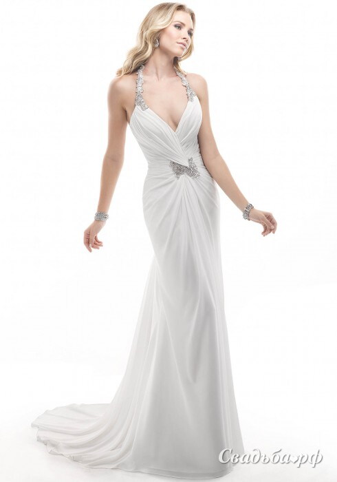 Роскошное и стильное платье идеально подойдет для свадьбы как в городе, так и на берегу моря. Искусно задрапированный лиф эффектно подчёркивает соблазнительную округлость женских форм. Бретели и декоративная композиция в центре модели, украшенные кристаллами Swarovski, придают платью ещё более изысканный и роскошный вид. Юбка – струящаяся, со шлейфом.