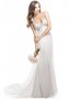 Кристаллы Swarovski в центре внимания на этом платье с глубоким V-образным вырезом. Тонкий шифон платья уравновешивает роскошно украшенный лиф и спину. Декоративные пуговички сзади, в стороны от которых расходится искусная мягкая драпировка, идеально подчеркивают стройный силуэт. Юбка со шлейфом делает образ ещё более изысканным и утончённым.