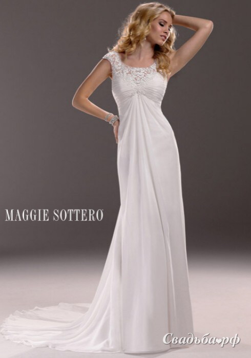 Нежное, легкое платье идеально сочетается с роскошной кружевной спиной. Тонкий шифон выгодно подчеркивает линии талии и бедер. Закрытые плечики придают силуэту невесты хрупкость. Вертикальный ряд жемчужных пуговиц сзади не только даёт начало лёгкой драпировке, но и визуально стройнит и удлиняет силуэт. Шикарный шлейф прекрасно дополняет образ.