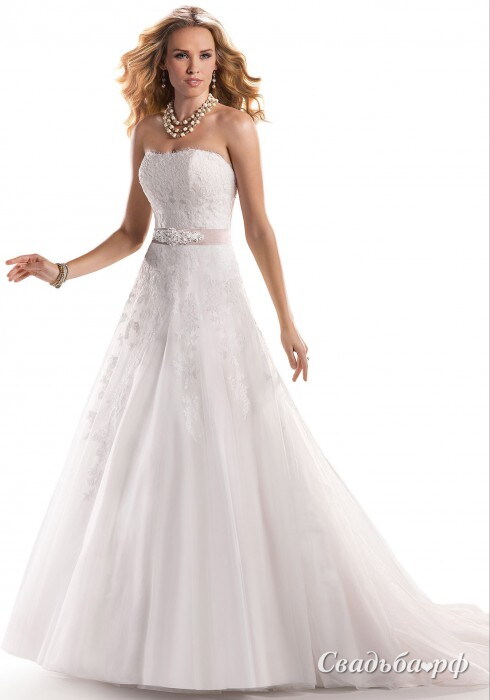 Классическое платье А-силуэта с открытым лифом. Модель идеально садится по фигуре, благодаря наличию шнуровки. Детали из кружева придают платью шикарный вид. Легкое мерцание бисера, искусно «рассыпанного» по платью, способно затмить даже свет вспышек фотоаппаратов. Пояс-ленточка завершает роскошный образ и выгодно подчеркивает талию.