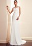 Элегантное и неповторимое свадебное платье. Вырез-лодочка и очаровательные рукавчики сформированы из кружевного полотна с изысканными ажурными узорами. Линия талии выделена узким пояском с блестящей вышивкой. Тонкий атлас модели идеально ложится по фигуре и эффектно подчёркивает все её достоинства. Платье заявляет о безупречном вкусе хозяйки наряда.