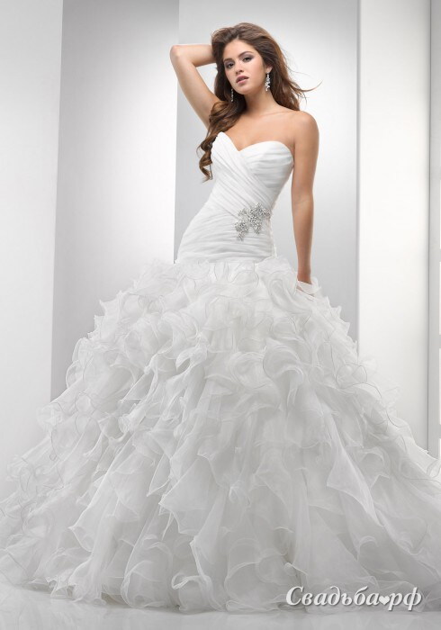 Великолепие пышных волн будто вырывается из тугого драпированного корсета, подчеркивающего фигуру. И без того роскошное платье, украшается оригинальной съемной брошью из кристаллов Swarovski, которую при желании можно заменить на тонкий ремешок, эффектно выделяющий линию талии. Платье идеально подойдёт для создания нежного и романтичного образа.