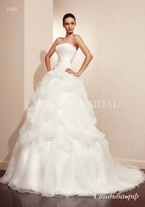 Пышное платье настоящей принцессы. Корсет украшен изысканным тонким кружевом с удивительно красивыми цветочными узорами. Поверх атласной юбки идет слой нежного фатина, выложенный объёмными подборами и украшенный кружевом. Линия талии эффектно выделена широким атласным поясом. Сзади расположена традиционная шнуровка из атласной ленты.
