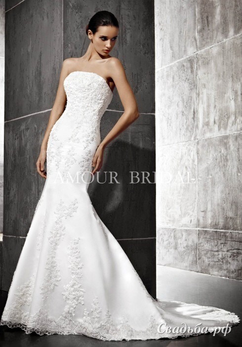 Такое элегантное и безупречное платье-русалочка. Платье, идеально облегающее фигуру, по всей длине украшено вышивкой ручной работы. Тонкое кружево, пришитое по краю платья, придает образу роскошь и утонченность. Эффектная шнуровка не только украшает спинку модели, но и позволяет легко добиться идеальной посадки корсета с прямым лифом на фигуре.