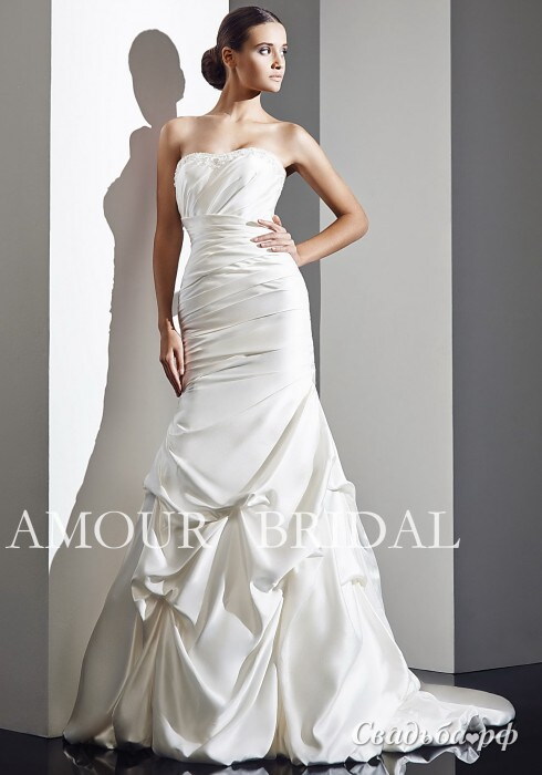 Шикарное, элегантное, классическое платье, выполненное из роскошного атласа. Платье идеально подчеркивает фигуру. Лиф украшен ручной вышивкой. Эффектная асимметричная драпировка формирует удлинённый корсет модели. Подборы на юбке придают силуэту изящность. Изюминкой платья является великолепный атласный шлейф с подборами.