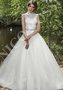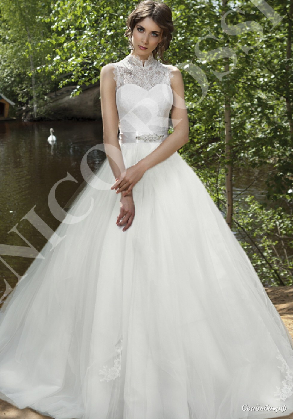Ravenna - аристократичное платье с кружевным корсетом и многослойной фатиновой юбкой с элементами кружева. Стильное и модное решение - кружевное декольте с имитацией воротника-стойки. По центру спинки проходит ряд элегантных пуговичек и удобная застёжка-молния. Широкий атласный пояс, украшенный изысканной сверкающей вышивкой, завязывается на бант.