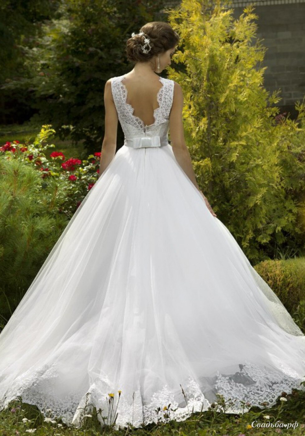 Поистине королевское свадебное платье с многослойной фатиновой юбкой поможет Вам создать образ сказочной королевы. Расшитый вручную пояс и открытая спинка в обрамлении тонкого кружева - изюминки данной модели. Зона декольте с ажурной вставкой придаёт образу таинственность и романтичную нотку. Платье дополнено нежным шлейфом.