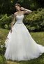 Мягкая драпировка из фатина поверх кружева на корсете делает это платье очень женственным и романтичным. Открытая зона декольте акцентирует внимание на плечиках и бюсте невесты. Пышная юбка с ажурными вставками переходит в красивый шлейф. Главный элемент - эффектный пояс ручной работы из бисера и кристаллов. Наряд выгодно подчёркивает талию.