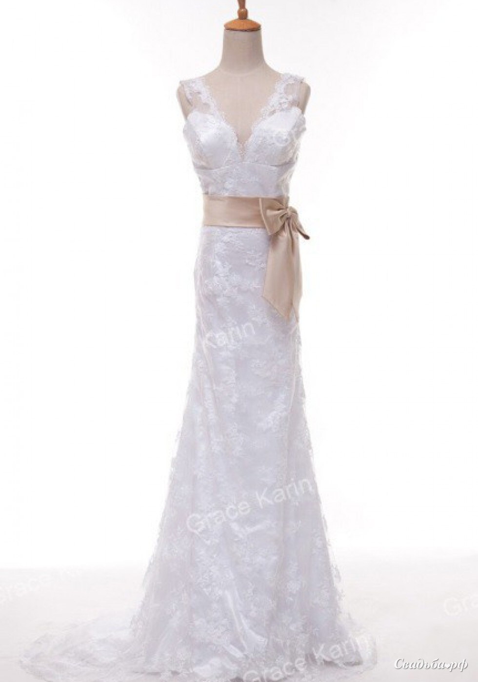 Чудесное свадебное платье, выполненное из тонкого французского кружева. Идеально облегает фигуру, V-образный вырез подчеркнет грудь.