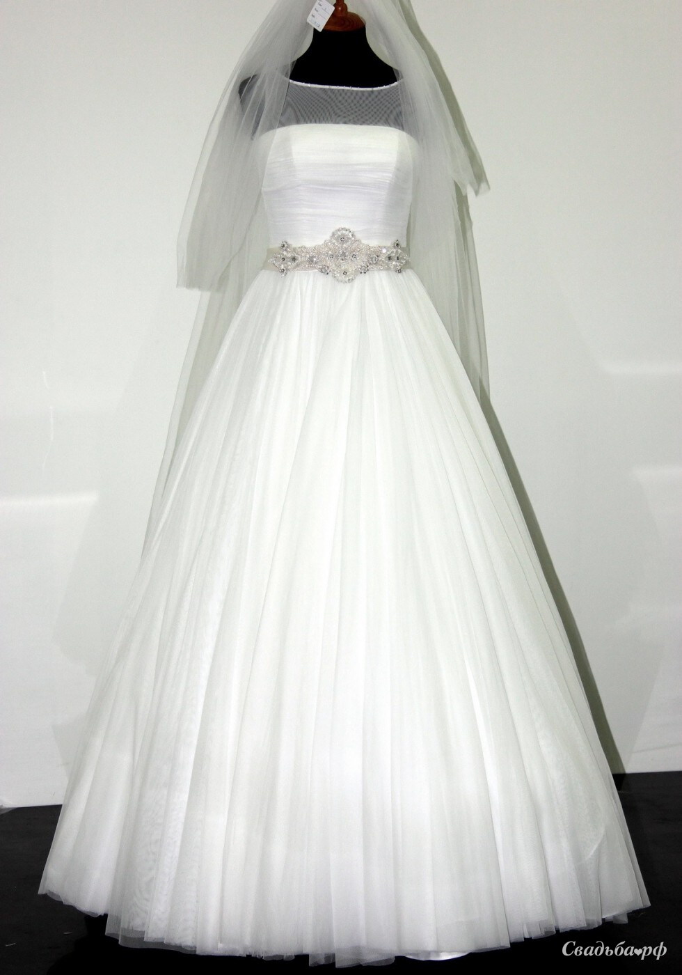 Такое легкое и изящное, свадебное платье А-силуэта. Выполнено из тонкого современного материала еврофатин. Тонкая сеточка закрывает зону декольте и полукругом заканчивается вырезом на спине. Съёмный пояс выбирается по вашему желанию и может быть выбран из любой гаммы.