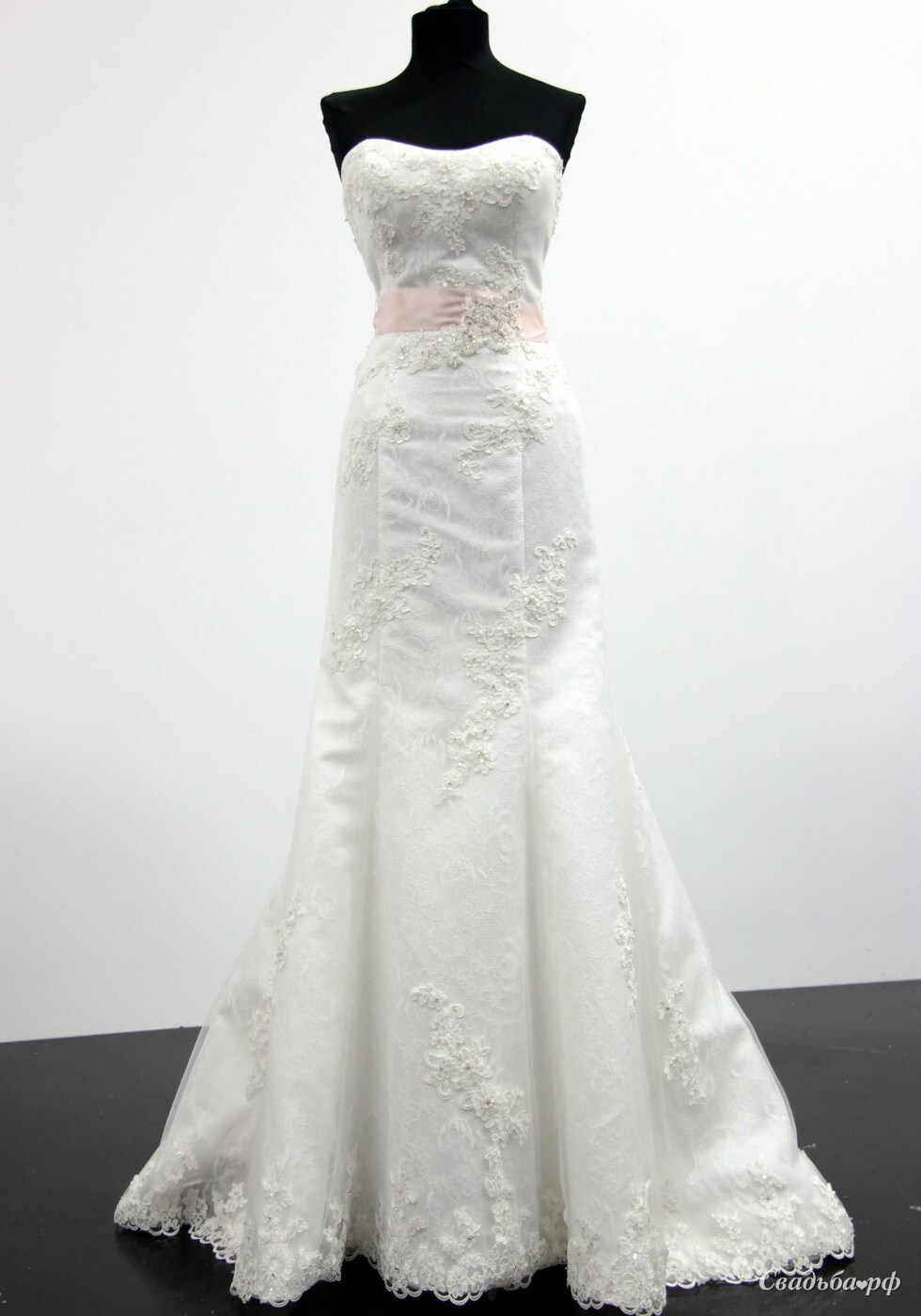 классическое свадебное платье силуэта рыбка. Платье сшито из тонкого гипюра с добавлением фрагментов французского кружева. Пояс в этом платье задуман дизайнерами в розовом варианте, но его легко изменить на любой другой цвет или убрать совсем.
