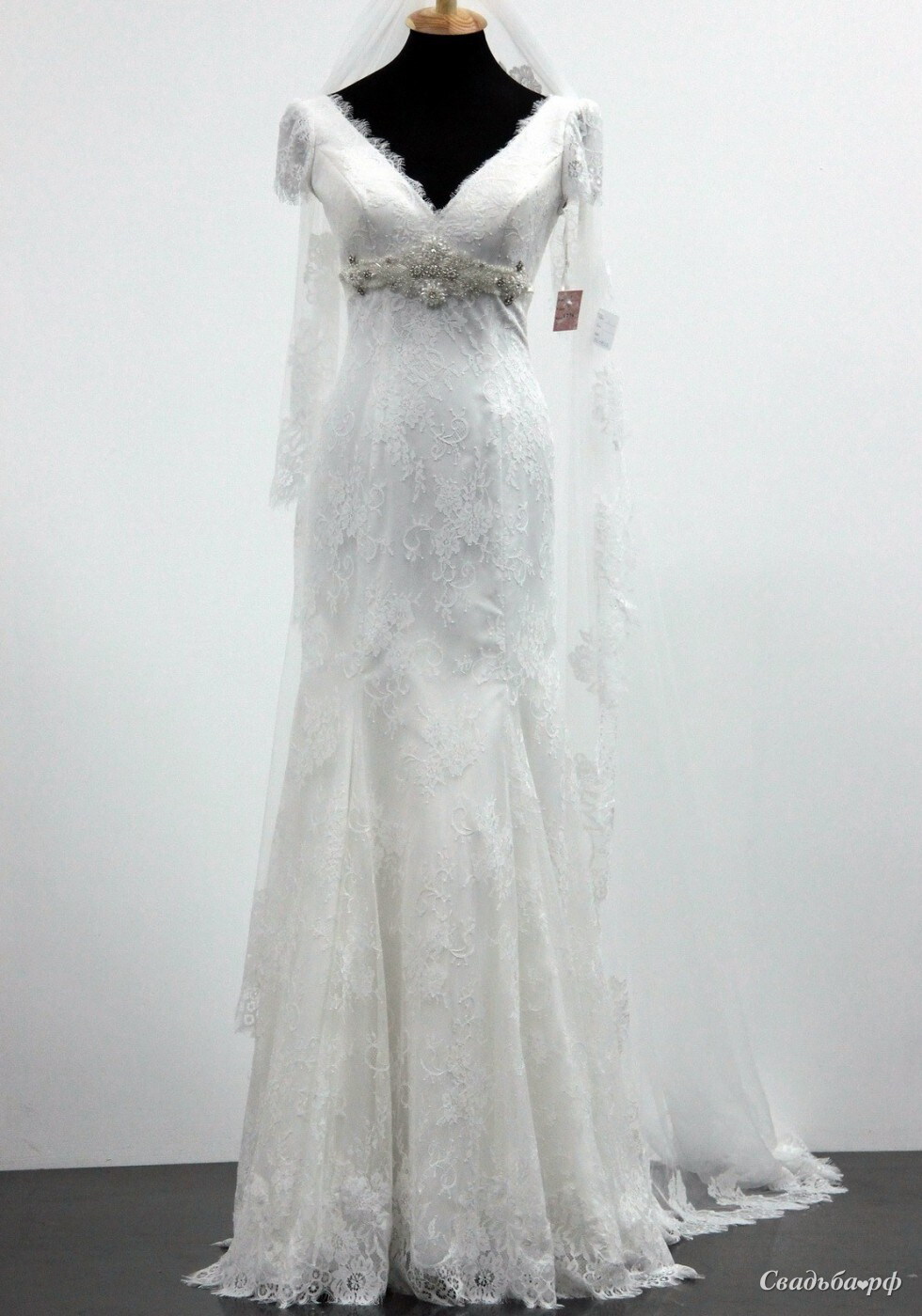 Чудесное свадебное платье из тонкого гипюра. Идеально подчеркнет фигуру. Вырез на декольте выполнен в V-образной форме, который плавно переходит в маленькие рукавчики. Вышивка из кристаллов под грудью, добавят яркий акцент к образу.