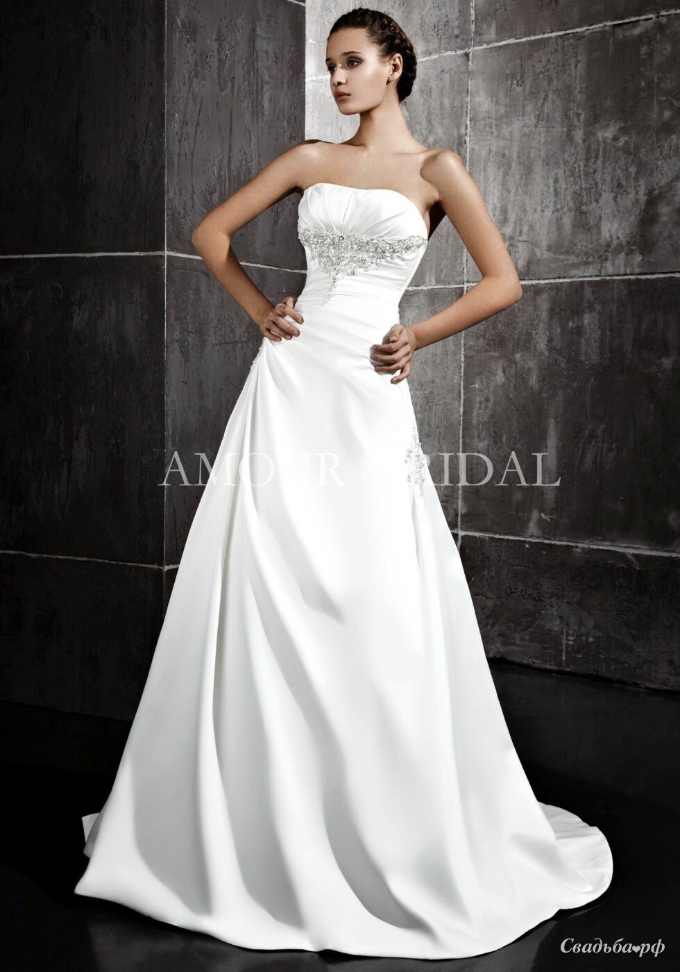 Атласное платье А-силуэта. Платье выполнено из блестящего атласа, который придет платью роскошный и богатый вид. Вышивка под грудью и на боку, добавляют платью выразительный акцент.