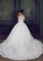 Несравненное пышное свадебное платье из кружева с богатым шлейфом. Перехваченное на талии расшитым сатиновым поясом с бантом, платье искусно подчеркивает все достоинства фигуры. Элегантный вырез лодочкой, нежно обнажающий плечики невесты, длинные утонченные рукава, вереница сатиновых пуговок на спине не отвлекают внимания от главного - потрясающих аппликаций расшитого кордового кружева по всему лифу и юбке.
