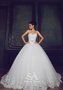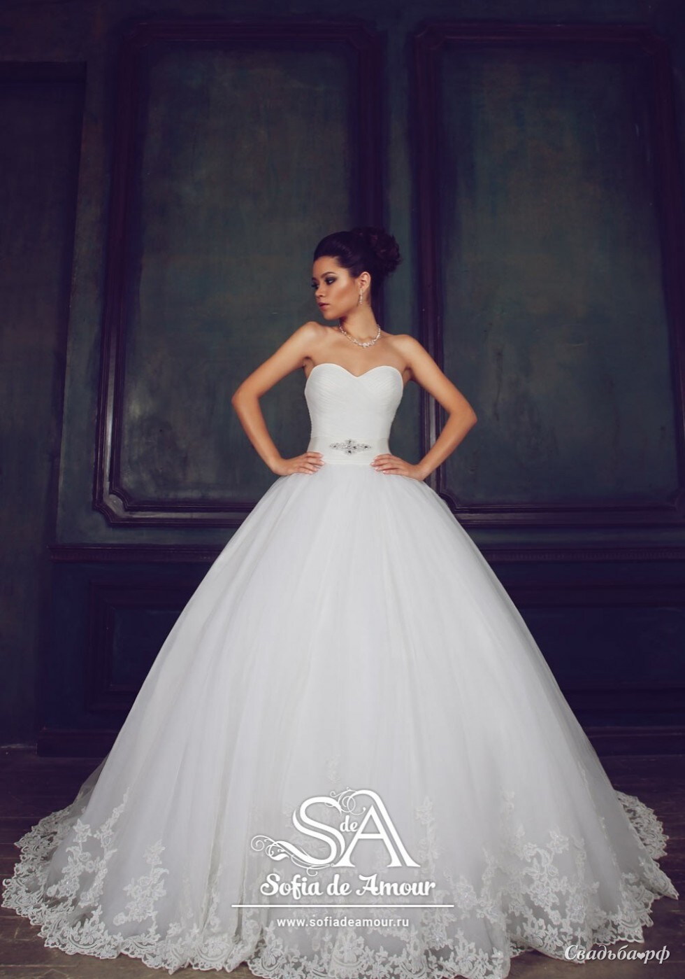 Стильное свадебное платье бального силуэта с пышной кружевной юбкой. Элегантный лиф драпированный тончайшим фатином, в сочетании со съёмной накидкой в виде декольтированной майки, придает образу невесты необычайную нежность и загадочность, в то время как заниженная талия и расшитый атласный поясок подчеркивают утонченность фигуры. Финальным штрихом является само кружево, богато декорированное кристаллами и пайетками искрящимися при солнечном свете и добавляющие необыкновенную роскошь.