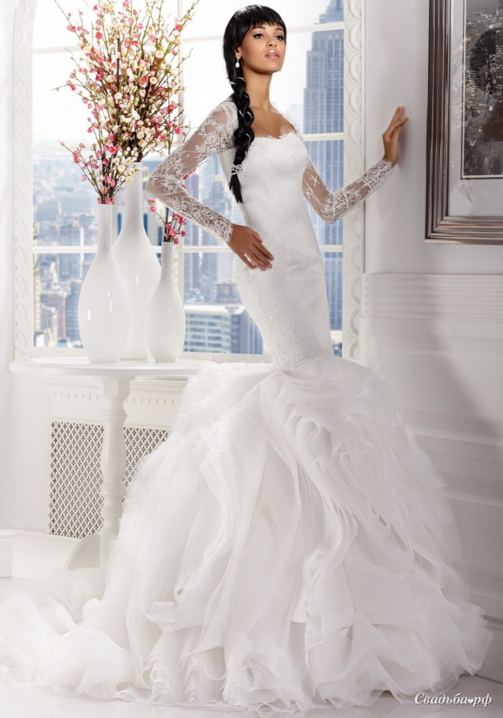 Шикарное сексуальное свадебное платье силуэта "русалка". Идеально подчеркнет фигуры, расставит яркие акценты нежным мерцанием, а роскошная юбка является законченным дополнением к этому великолепному образу.