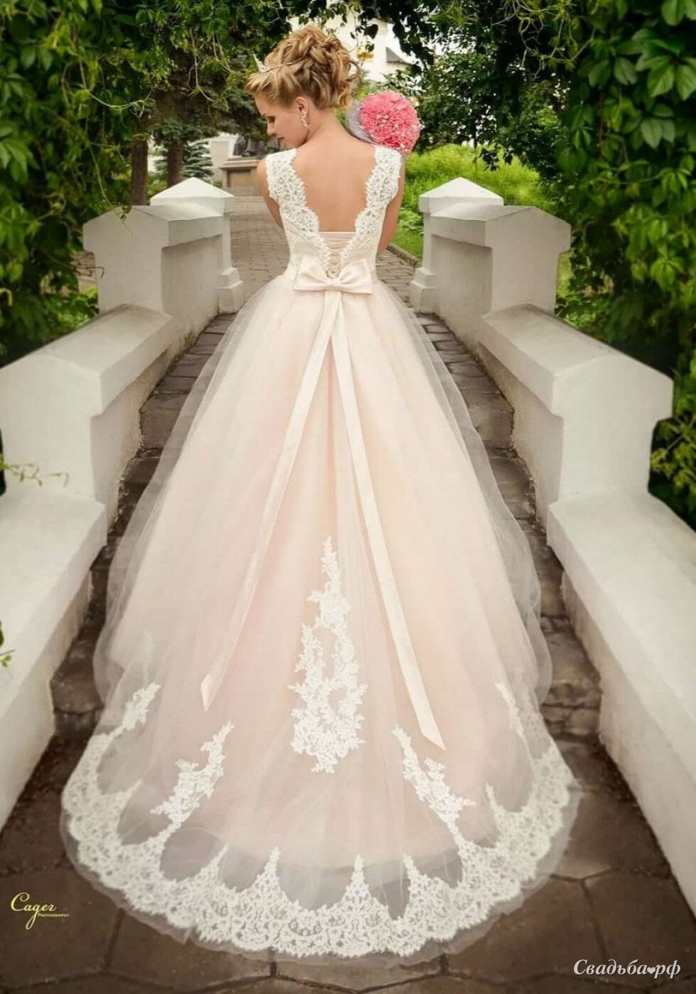 Великолепное платье А-силуэта в изящном пудровом цвете. Декольте платья выполнено из французского кружева. Такие же элементы кружева удачно разбросаны по шлейфу платья. Съёмный пояс-бантик удачно заканчивает образ милой невесты.