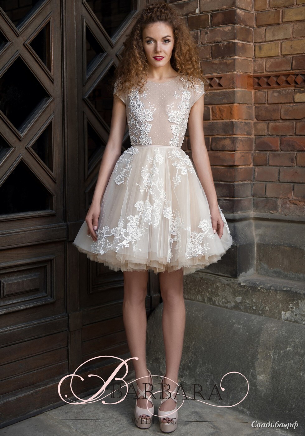 Этот вариант короткого платья идеален в посадке на фигуре. Передняя часть платья изготовлена из декорированного горошинками фатина, поверх которого нашиты аппликации кружева ручной работы. Юбка у платья пышная, легкая и воздушная, благодаря вшитому фатину. Спинку платья украшает красивый круглый вырез, который расшит цветочным орнаментом.