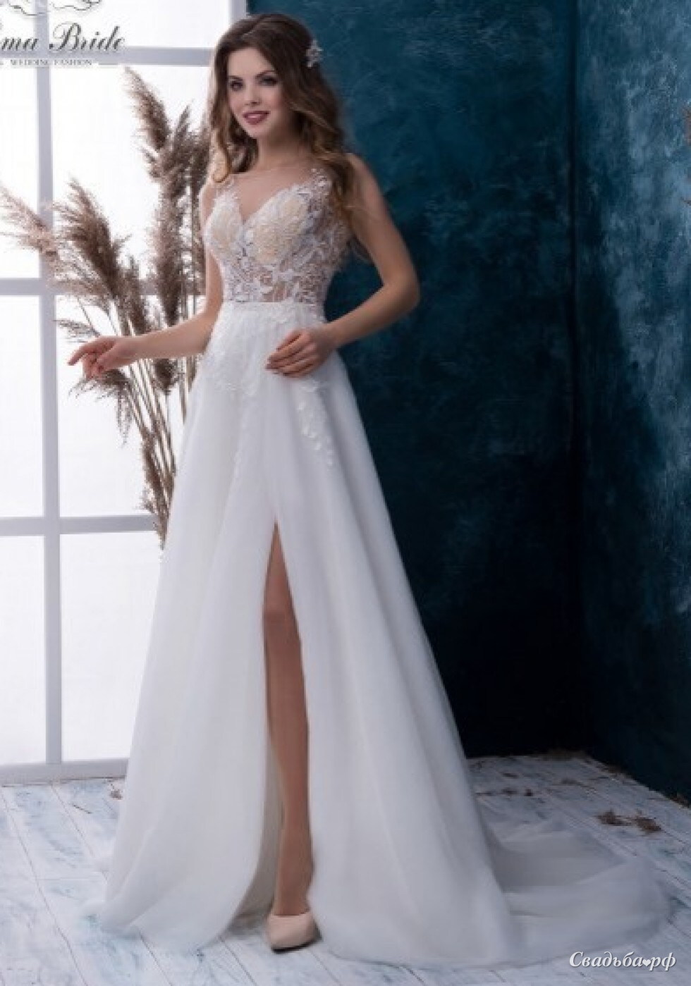 Легкая и неповторимо изящная модель этого платья выполнена из струящихся тканей и великолепного кружева. Необычный вид платья получается благодаря элегантному разрезу по ножке невесты.