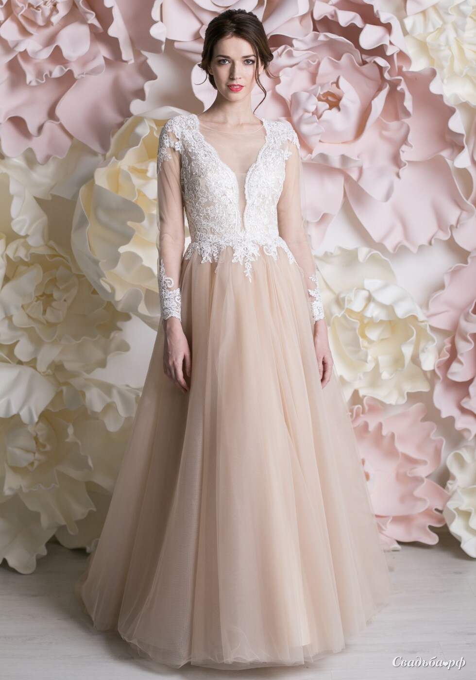 Легкое и изящное платье А-силуэта модного в этом сезоне цвета пудры. Платье украшено изящным кружевом шантильи.