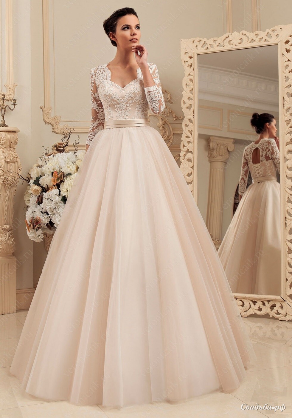 Классическое платье А-силуэта, благодаря легкой, невесомой юбке, идеально подойдет и принцессе, и леди. Длинный рукав закрывает ручку, а V-вырез на груди подчеркивает достоинства фигуры.
