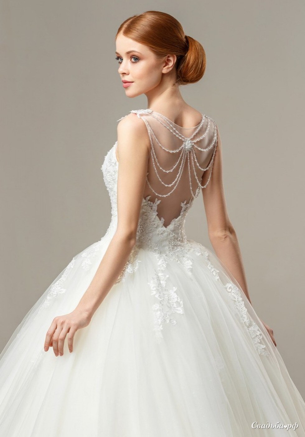 Настоящее платье принцессы. Объемные мягкие юбки платья спрятаны в кружевной корсет. Спина платья — это настоящий шедевр. Жемчужные нити плавно свисают по спинке, тем самым бесподобно украшая платье.