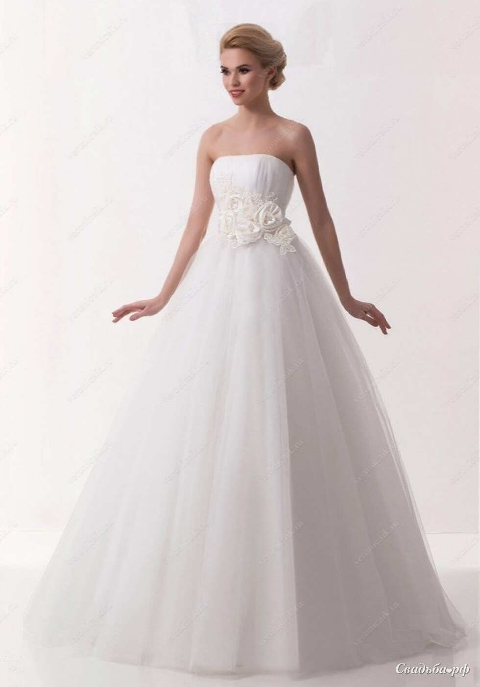 Милое и легкое платье А-силуэта, а при добавлении юбок легко станет пышным. Платье выполнено из струящегося фатина, под грудью платье задекорировано композицией цветов, которая при желании снимается.
