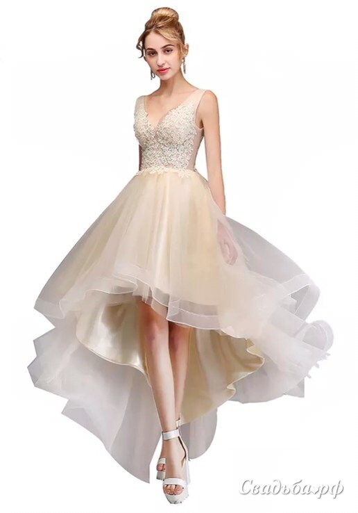 Платье нежное и утонченное. Фасон маллет - короче спереди, для того чтобы придать изюминку образу. Корсет расшит изящной вышивкой из легко мерцающих кристаллов и жемчуга.