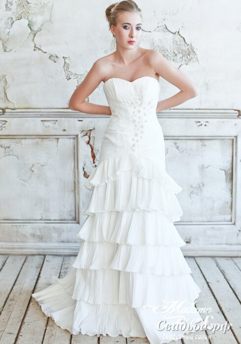 Элегантное платье-трансформер придётся по душе самым креативным невестам. Многоярусная юбка одним легким движением становится короткой, что позволит вам предстать в абсолютно двух разных образах в один свадебный день. Драпированный корсет с открытой зоной декольте украшен ручной вышивкой. Модель зрительно увеличивает бюст.