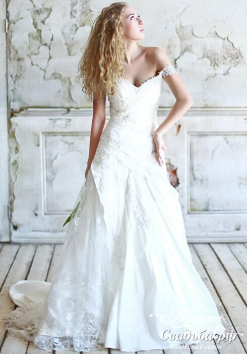Оригинальное свадебное платье от лучших испанских дизайнеров подчеркнёт не только достоинства фигуры, но и ваш безупречный вкус. Драпированный корсет соблазнительной зоной декольте и приспущенными плечиками придаёт наряду особую пикантность. Длинная юбка с кружевными вставками расширяется к полу. Модель дополнена шлейфом.