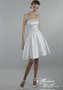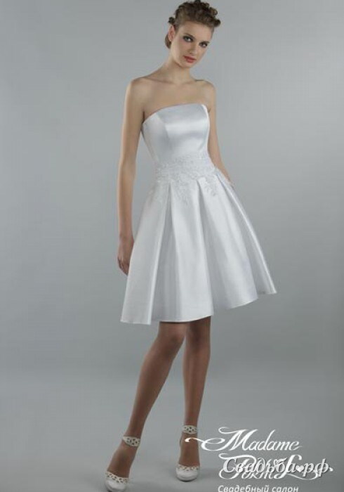 Свадебное платье от французских дизайнеров придётся по душе самым кокетливым и жизнерадостным модницам. Элегантный корсет с открытой зоной декольте зрительно увеличивает бюст. Талия декорирована ручной вышивкой. Пышная юбочка с широкими складками едва доходит до уровня колен. В этой модели вы сможете продемонстрировать свои ножки.