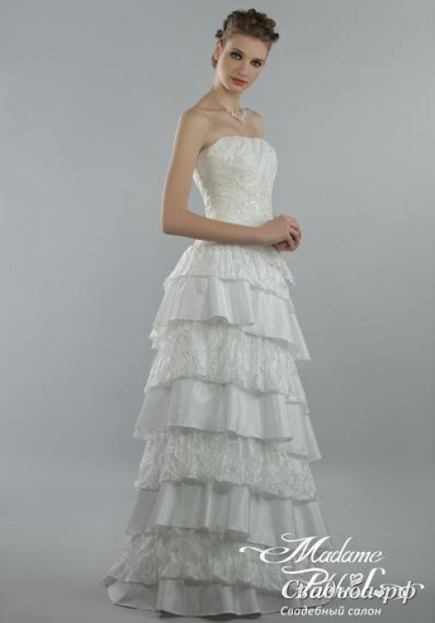 Очаровательный наряд для самых нежных невест. Это свадебное платье от французских дизайнеров выполнено из высококачественной тафты. Изящный корсет с открытой зоной декольте гармонично сочетается с многоярусной юбкой. Представленная модель выгодно подчёркивает все достоинства фигуры и мягко скрывает её недостатки.