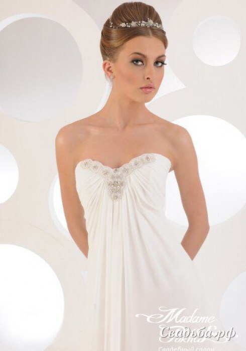 Струящееся свадебное платье из лёгкого шифона поможет вам почувствовать себя настоящей греческой богиней. Этот наряд от лучших французских мастеров зрительно вытягивает силуэт. Корсаж с открытой зоной декольте обрамлён сверкающей вышивкой ручной работы. Модель привлекает внимание к бюсту и выгодно подчёркивает достоинства фигуры.