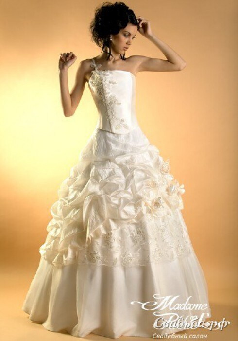 Если вы хотите почувствовать себя прекрасной принцессой, то это французское платье создано специально для вас. Атласный корсет с открытой зоной декольте и единственной бретелью украшен ручной вышивкой. Пышная юбка дополнена объёмными сборками драпировки и кружевными вставками. Наряд выгодно подчёркивает все достоинства фигуры.