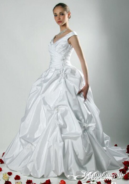 Если вы хотите почувствовать себя настоящей королевой, то это свадебное платье создано специально для вас. Эффектно драпированный корсет с открытой зоной декольте и широкими бретелями-плечиками выгодно подчёркивает талию и зрительно увеличивает бюст. Пышная юбка с объёмными сборками дополнена кокетливым шлейфом.