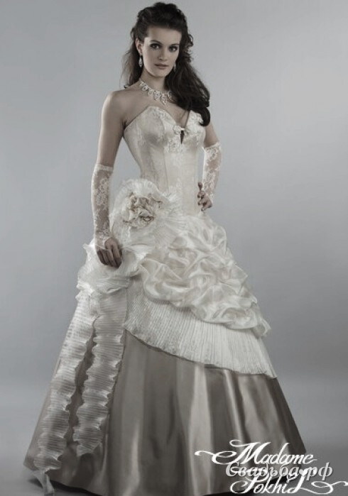 Восхитительное свадебное платье от лучших французских дизайнеров достойно настоящей королевы. Плотный корсет с соблазнительным вырезом на груди выгодно подчёркивает все женственные изгибы фигуры. Пышная юбка декорирована объёмными сборками драпировки, крупным бантом на бедре и длинными лентами. В таком наряде вы будете на высоте!