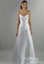 Если вы предпочитаете элегантность и безупречные формы, то это свадебное платье от французских дизайнеров придётся вам по душе. Наряд выполнен из благородного атласа. Драпированный корсет с пикантной зоной декольте выгодно подчёркивает все достоинства фигуры и мягко скрывает её недостатки. Длинная юбка слегка расширяется к полу.