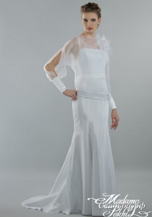 Великолепный свадебный наряд от французских дизайнеров дополнен полупрозрачной накидкой с длинными рукавами и крупным цветком на груди. Платье с открытой зоной декольте и тонкими бретелями выгодно подчёркивает бюст. Длинная юбка струится до самого пола и зрительно вытягивает силуэт. Шлейф придаёт модели особый шарм.
