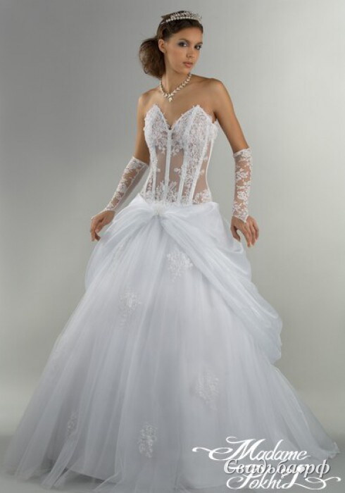 Оригинальное свадебное платье от ведущих французских дизайнеров придётся по вкусу самым дерзким модницам. Полупрозрачный корсет с пикантной зоной декольте привлекает внимание. Верхняя часть пышной юбки дополнена объёмными сборками драпировки. Кокетливый шлейф придаёт модели особый шарм. В таком платье вы будете неотразимы!