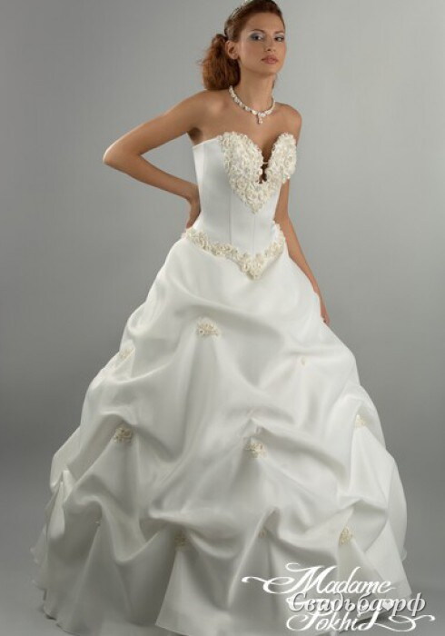 Если вы хотите почувствовать себя настоящей королевой, то это свадебное платье от ведущих французских дизайнеров придётся вам по вкусу. Элегантный корсет с пикантным вырезом на груди выгодно подчёркивает талию и зрительно увеличивает бюст. Наряд декорирован объёмной вышивкой ручной работы. Пышная юбка с необычными сборками смотрится эффектно.