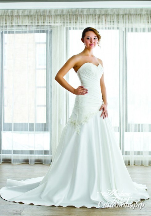 Наша новая коллекция!!! Утонченное платье, которое подойдет для любого типа фигуры. Строгий удлинённый корсет с открытым фигурным лифом по всей длине украшен изысканной асимметричной драпировкой. На боку расположена оригинальная цветочная композиция из ткани. Мягкая юбка великолепными волнами ниспадает на пол и превращается в шлейф.