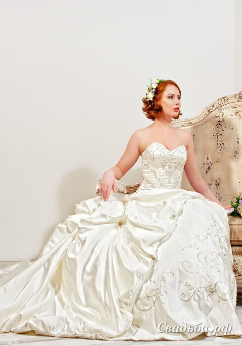Красивое свадебное платье из атласа с роскошным шлейфом. Корсет с декольте в виде сердца и юбка расшиты золотом и декорированы бисером. Корсет украшен изящной драпировкой и прекрасно гармонирует с пышной юбкой. Юбка декорирована прихватами и украшена изящной вышивкой. Привлекает внимание объемный шлейф.