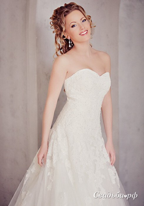 Нежное свадебное платье без бретелей. Корсет богато украшен изысканным кружевом, декольте выполнено в виде сердца. Верх платья плавно переходит в невесомую воздушную многослойную юбку. Верхний слой юбки по краю украшен кружевной лентой. Завершает образ фата, украшенная по контуру великолепным кружевом.
