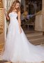 Нежное свадебное платье с кружевным корсетом, который переходит в невесомую пышную юбку из фатина. Фигурный лиф соблазнительно подчёркивает округлость женских форм. Корсет плотно обтягивает фигуру, акцентируя линию талии и бёдер. Юбка завершается роскошным невесомым шлейфом. Платье Соланж создает образ неповторимой невесты.