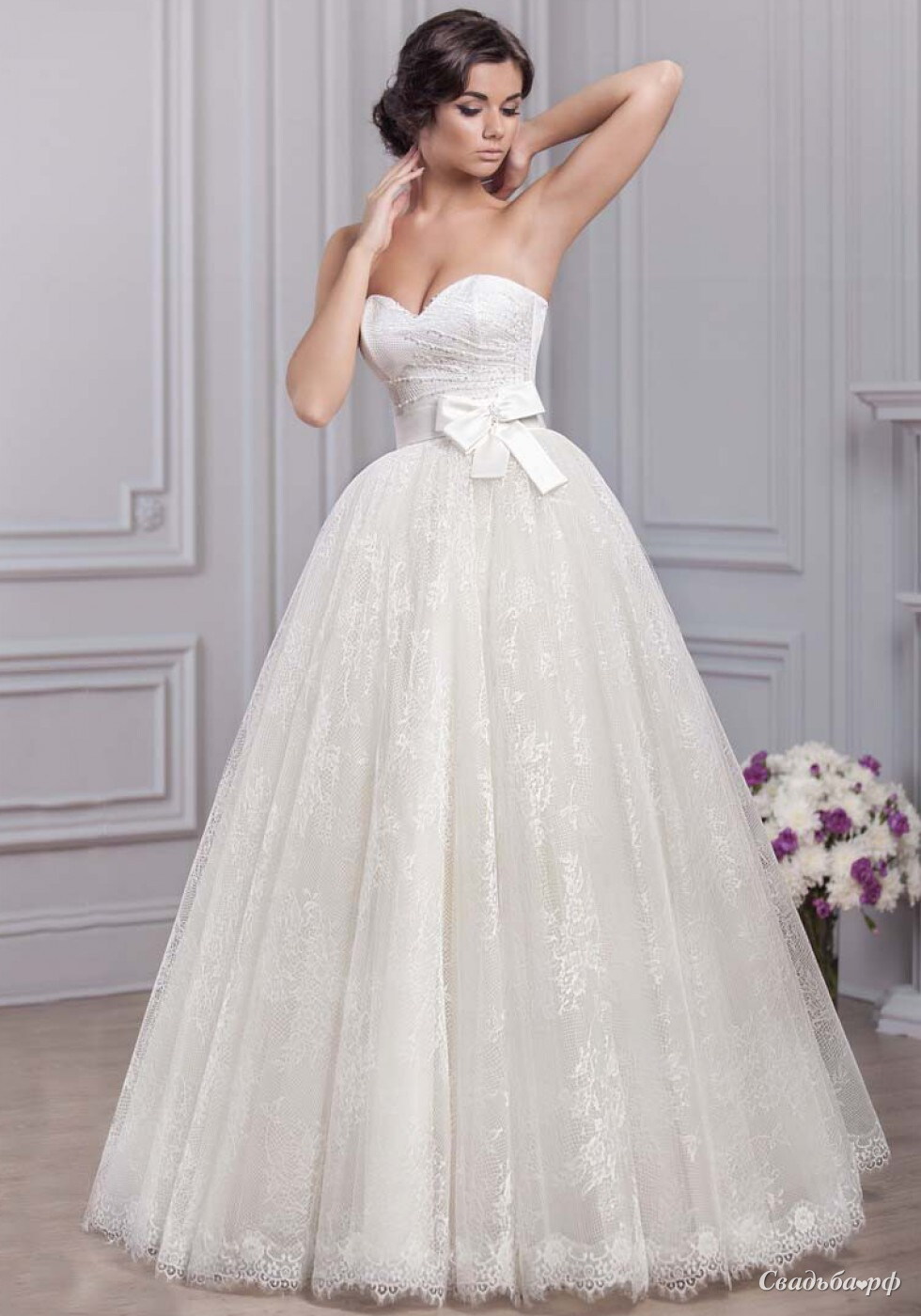 Платье из тончайшего кружева-паутинки с расшитым стеклярусом лифом, подойдет и для очень миниатюрной невесты.