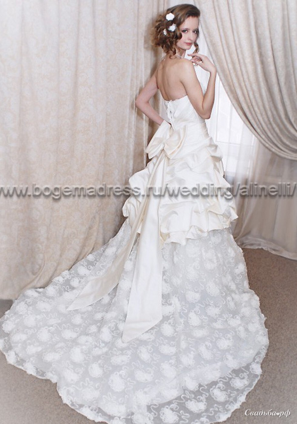 А-образное платье, драпированный корсет из атласа и кружева, юбка с подборами.